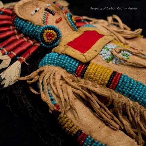 A Chief doll, Plains Native American, probably Sioux. The doll has tan leather face, tunic, and leggings. His clothing is fringed and decorated with blue, red, yellow beadwork. He has a fancy, hand painted feather headress with red satin-like fabric covering the base of each feather. A beaded headcovering at the sides of his head is covered with 5/8" diameter beaded circle designs at the ear area. There is an red old trade cloth loin cloth (edged with gold cotton) hangs at front and back from waist. A smaller red old trade cloth hanging collar is at neck, and a 3/4" rosette is at center front of tunic. Approximately 14" tall from tip of feathers to feet. Donor states that the doll's long dark hair is buffalo hair. The doll's face is beaded and painted. Donor states that the face painting was done at a later date.