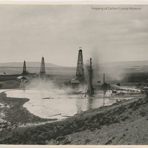 A black & white print. Image shows three oil derricks, several out buildings, a stationary steam engine emitting smoke plumes & a very large settling pond (in foreground). Sparsely vegetated. Hills in far distance.