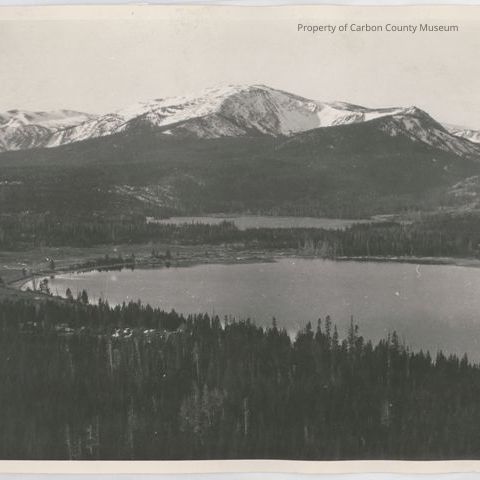 Update 1/2008: Black and white print. Image of two mountain lakes from a slight elevation. Forested shoreline with open area at left center. Snow-capped mountain in background. Larger lake through center with smaller lake at base of mountain-separated by narrow forested landstrip.