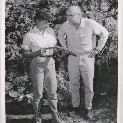 Black & white print. Snapshot. Image of a woman showing a mammoth bone to a man standing next to her. Woman is dressed in a patterned short sleeve shirt, light work pants, boots & a dark baret. Man is dressed in a long sleeve light colored shirt, light colored pants (work shoes); he has his hands on his hips; he is wearing glasses & is nearly bald. Sage-covered hill behind.