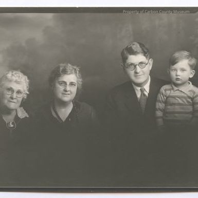 Update 2008: Black and white studio proof? print with negative edges showing on all sides and Eastman-Kodak in mirror image right side. Portrait shows backdrop of faint trees and clouds. Left to right is an older woman with white hair, rimmed glasses, dark colored dress with white collar. Next is a middle aged woman with short dark hair, rimmed glasses and dark colored dress and dark strand of beads around heck. Next to her is a middle aged man with dark hair, rimmed glasses, wearing a dark suit, white shirt and patterned tie. To his left is a toddler boy standing at the man's left shoulder. he has medium dark hair and is wearing a striped pulldown shirt with collar. he has light colored eyes.