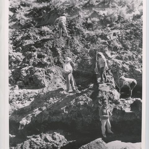 Written on back: [pencil] "43610" [black ink] "Excavation of the U P Site Sage Chicken Springs (miscalled Hollow Springs). Dr. George Agogino in bottom of pit. Mrs. Irwin at right near skeleton or recent coyote & one of Dr. Agogino's daughters at far left. The cords are for laying off the area into grids to record the exact position of any find."
