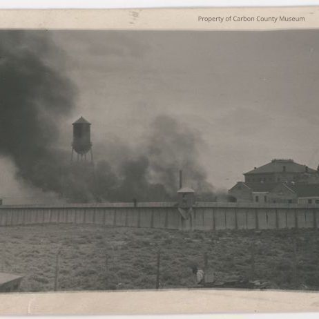 Update - 2009: Black & white copy print. snapshot. Image of dark smoke rising from a group of large buildings behind a wall with guard towers at intervals. Tall water tower is visible above the smoke. Fence, prairie & person in foreground.