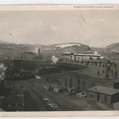 Update 3/2010: Black and white print. Snapshot. Image from above of the round house at the Rawlins Wyoming rail yard. Series of tracks leading into the "turn table" with many steam engines in line. Rail yard and town at right background. Hill with gap in far background, patches of snow on hills.