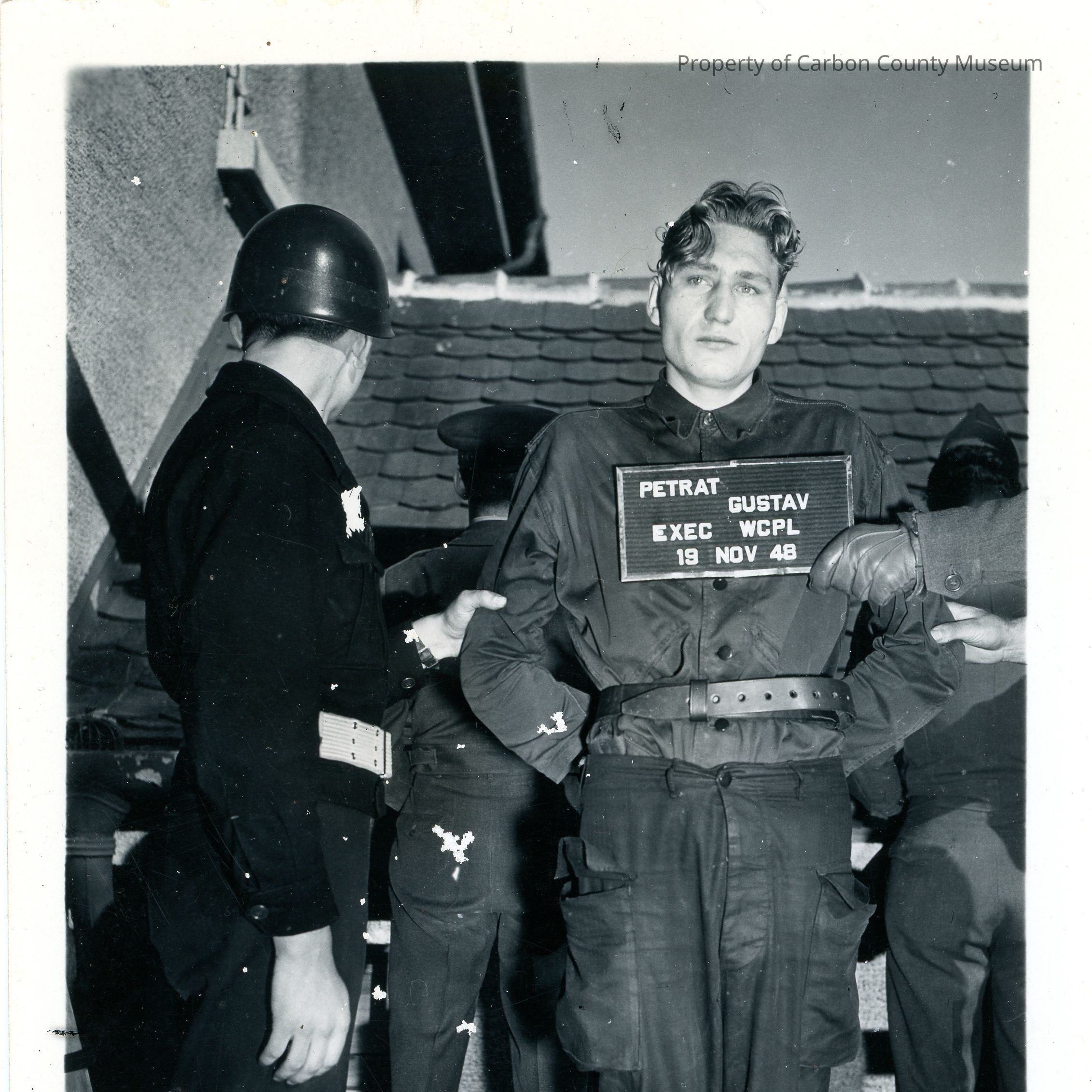 Black and white photograph. A man in a prisoner uniform is being held in place by a man wearing a military uniform - he is facing away from the camera. Behind the two are two more men wearing military uniforms with their backs to the camera. Held in front of the prisoner is a placard that reads "Petrat Gustav EXEC WCPL 19 Nov 48".