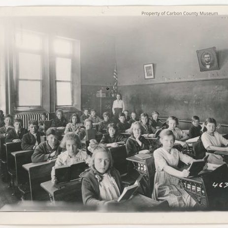 Two black & white prints. Snapshot. Image of a grade school? class seated at their desks with books open - some holding their books up. Teacher is standing in far corner of room at center background near the American flag & a bookcase. Two photos on wall above blackboard - one is a portrait of Abraham Lincoln.