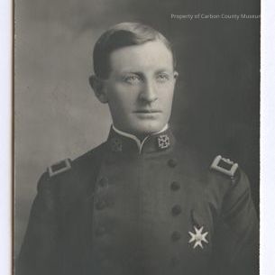 Update 2008: Black and white print portrait view of W.W. Daley dressed in dark uniform with small shoulder patches on each shoulder, high neck collar with white edging and two even armed crosses, one on each side of collar. His jacket is double breasted with fabric covered round buttons. There is a starburst type medal attached to left side of jacket chest. His short medium colored hair is parted side left and combed to right . Background is faint appearance of clouds.