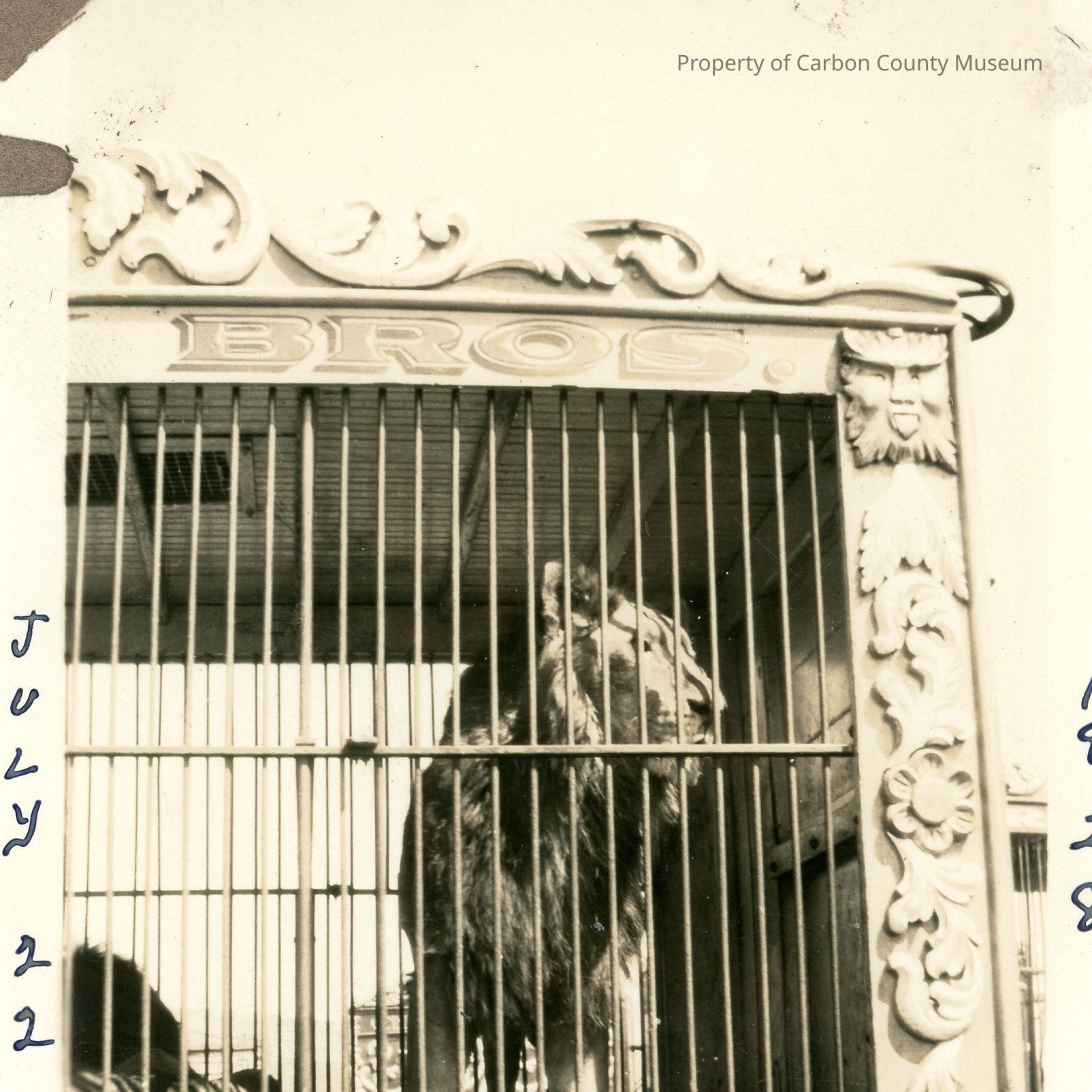 Black and white photograph. A male lion is standing in a cage. Written along the top edge of the photograph is "RAWLINS", written along the bottom is "LIONS", written vertically along the left is "JULY 22", written vertically along the right is "1928". Printed on the reverse is the number 28, also present is a circular green stamp that reads "MEYERS PHOTOS PHOTO FINISHING RAWLINS, WYO".Collection