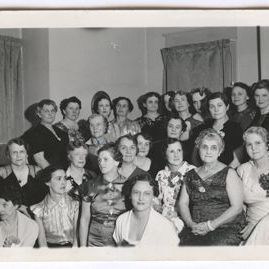Black and white glossy print of a large group of women in dressy evening wear. Thirteen of the women appear seated in the first three rows in foreground. Twelve women are standing against the back walls which are light in color with medium toned long drapes on window left and window background. The women all have short hair. Several wear glasses of wire frames. Five of the women have elaborate corsages attached to their dress bodices.