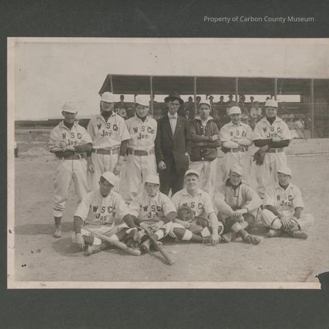 Update 3/2010: Two black and white prints. Snapshot. Mounted on grey matboard .Image of a baseball team posed on a dirt field. All are wearing uniforms with "W S Co Jrs" on front except man standing at center who is wearing a dark suit and light colored shirt with bow tie. Spectators in a grandstand fronted with chicken wire in background.