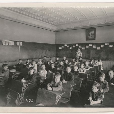 Black & white print. Snapshot. Image of a grade school class seated at their desks in a classroom. Teacher is standing at the back of the class. Pictures on both blackboards & a framed picture above at right.