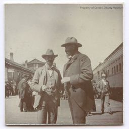 Update 2008: Black and white print affixed to ivory matboard of two men standing by a passenger train on the tracks to their left with clusters of men and women in the background. A depot is to the back left of photo. The man on left is wearing a three piece medium color suit with chain and fob on center vest . He has his jacket open. He has a high crowned hat on and a wide mustache. His white shirt is high collared with a bow tie. Man on right is in side view and he has darker colored pants and prince Albert style jacket . He has a goatee and a mustache. A medium colored hat with brim sits atop his head.