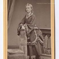 Update 2008: Black and white print attached to pale orange matboard with a darker line surrounding edges of matboard surrounding print. Print is a studio portrait of a young woman standing with her hands and forearms resting on top of a high back velvet chair with fringe hanging down from seat edge. A wooden railing shows behind her side right. She has center parted hair held back with a white ribbon. She is wearing an ornate dark dress three fourths in length. Dress appears to be several layers. Top bodice has center closing, dual collars, one white, one darker which has gathered ruffle and braid on edges. Top has choir robe type sleeves with extremely large wide opening with identical braid and ruffle trim. apron type overlay over skirt is of matching fabric with outer edges composed of matching braid and ruffles front and back (bell shaped). Skirt back may have a ruffle. She is wearing a dark lace boots with large cuff on heel.