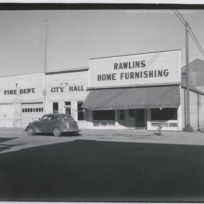 Update February 2011: View 2: Black & white glossy print. Image of a street scene with three attached white frame buildings. Building at left has two garage doors & "Fire Dept" painted above doors. Second building has: "City Hall" painted above door & two windows. On the window, in the door it reads: "City Hall" "Police Dept.". Third building has a striped awning rolled out above the store front. Painted above awning: "Rawlins Home Furnishings". A vintage car is parked on the street in front of third building. On left, the Fire Dept. building extends back & sits adjacent to a rock building with a tall chimney pipe. On the back of the Fire Dept, roof is a tower with shingled roof & small platform attached to the top. In the distance is a tall dark building & on photo right a two story stone building with windows on upper level.