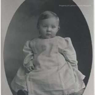 Black and white copy print, oval on a square, of a young child in white layered christening gown or dress. Could be a boy or girl. Light hair is parted and combed to side. The child is sitting on a fur rug and is wearing dark shoes. Right hand is on lap and left is behind.