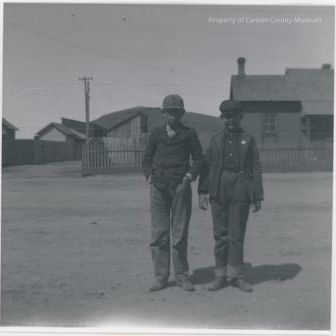 Black and white glossy print of two boys standing in a street facing front. The boy on the left has a cap, buttoned jacket, long pants. His hands are in his pockets. Boy on right has on cop, open jacket with a button on lapel. His hands are at his side. Buildings in background with picket fence and dirt street. See image 2008.1008.1.582.