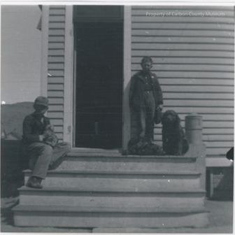 Print 1: Boy on left is sitting on top step of 4. He is holding a cat . He wears a cap and buttoned jacket. Boy on right is holding his hat in his left hand. His jacket is open. He has a pin on his lapel. His right foot is resting on a dog laying on the top step. Another dog is on his left. Same boys as in 2008.1008.1.579.