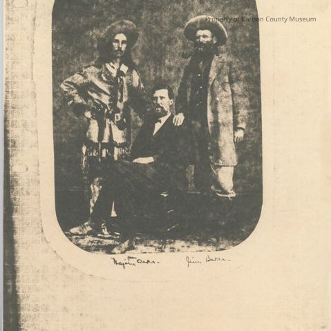 Update 1/2008: Photocopy of a print. Image of three men. Studio pose. Man at center is seated; flanked on either side by man standing-man at right has his right hand on the shoulder of the seated man. Man at left has his left hand resting on the chair back. Man at right is wearing a heavy coat, light pants tucked into dark boots, a dark shirt or vest and wide brimmed hat. He has a pipe in his mouth and a full beard.