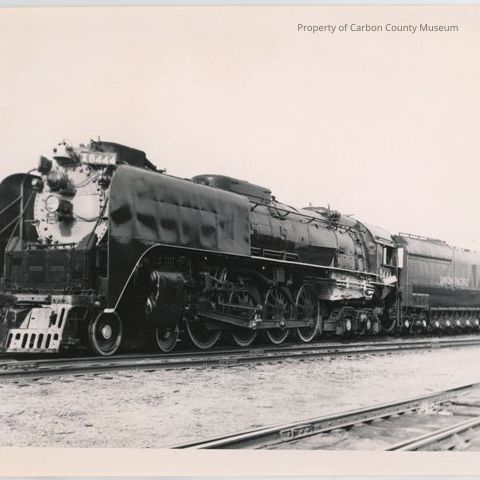 Update 2/2010: Black and white print. Snapshot. Image of a locomotive engine and car parked in a rail yard. Union Pacific engine #8444. Modern looking streamlined front with patterned side panels. Appears to be an early diesel engine. Tracks in foreground.