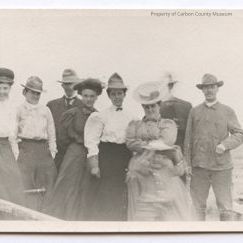 Update 2008: Black and white print postcard of five women, three men and a young boy in a linear group photo. Lady on left is standing by a wooden wagon with its wooden tongue in front of her on the ground. Her right arm is resting on wagon top edge. She is dressed in long skirt, white long sleeve blouse an round crowned dark hat. other women are wearing long length dresses or skirts with long sleeve tops. They are all wearing hats Woman in center front is wearing white ballon sleeve blouse, long black skirt, gauntlet gloves, pointed? high crowned hat with small black bow tie. Woman side right is wearing a medium colored dress with flat straw hat on her updo dark hair. She has her arms crossed in front of her . The young boy standing in front of her is blurry, but appears to be holding his hat on his head with both hands. Two of the men are standing behind women and are difficult to see. A man on right has medium colored pants, long sleeve jacket type shirt with his left hand in his jacket bottom pocket. Desert expanse is to his back right. He is wearing a wide brimmed hat.