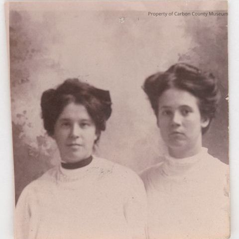 Update 2/2010: Black and white print of two unknown young women. They both are wearing white high neck blouses and their dark hair is arranged in an updo. The woman on side left has a black under collar. There is a shadowy backdrop. This print came from album #1973.553.0004.