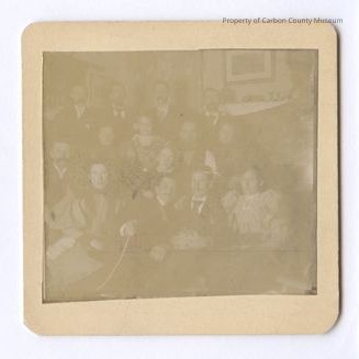 Update 2009: Black and white print attached to ivory colored matboard. Print shows a large group of men and women dressed in vintage clothing and seated informally in rows with top two rows standing. Women on far right front row wearing blouse with very large puffed sleeves.