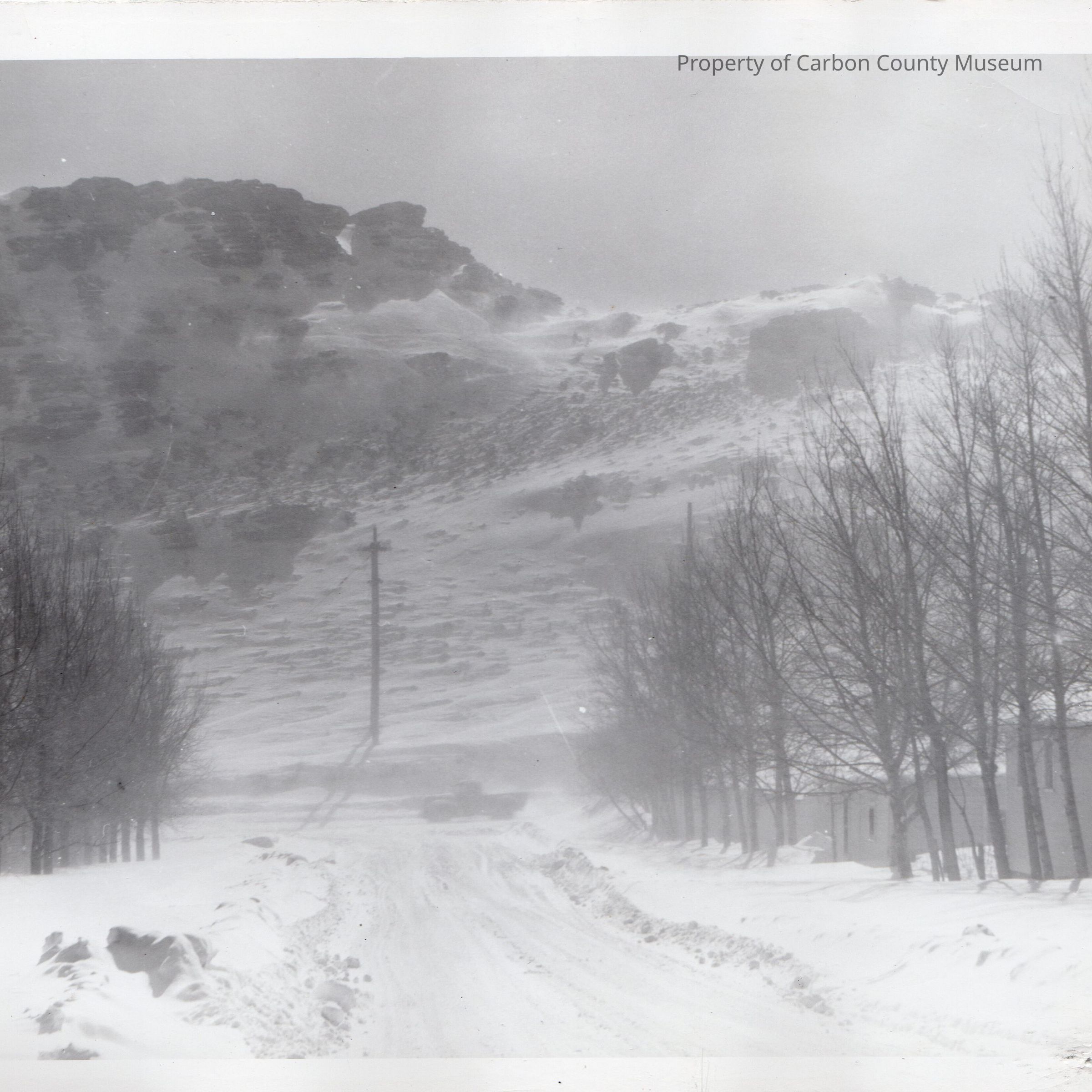 Update 2008: Black and white print of 15th street looking south during the blizzard of 1949. View shows deep snow on either side of snowy roadbed. Rows of tall dormant trees line the sides of the street. The mountainous cut on Spruce Street shows in background with pockets of deep snow on different levels of the hillside. An electrical pole at end of road and a dark truck are seen on Spruce street.