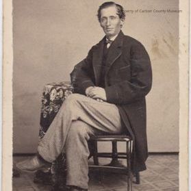Black and white small photo, studio portrait of a man sitting in a chair with his left leg crossed over his right and hands in his lap. his hair is parted. He is clean shaven. He wears a bow tie, shirt, vest and jacket with plaid or striped pants.
