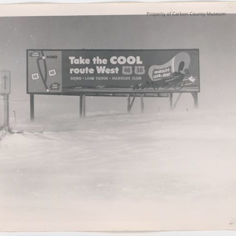 Update 2008: Black and white print taken during blizzard of 1949 showing deep snow and large billboard that has a road map route on left and a covered wagon on right. it reads: Take the cool route West (40) (30) Reno Lake Tahao Harold's Club. Written on side of covered wagon: Harolds Club or Bust. On left of sign is a concrete Lincoln Highway Marker with a reflecting arrow. Sagebrush is at base of marker.