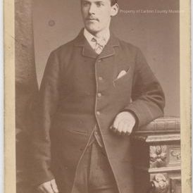 Black and white studio portrait of a man standing with left elbow propped on an ornate stand. He has a tie, white shirt and buttoned jacket with hankerchief in breast pocket. His hair is parted in center.