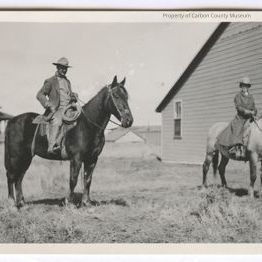 Update 2008: black and white postcard print of a man sitting on saddle astride a black horse He is wearing knee length boots, striped shirt, darker jacket, banana tied around neck and lighter wide brimmed hat. A coiled rope is attached to saddle horn. On photo right near large framed building is a woman astride a lighter colored horse that has darker legs and face and close cropped mane. The woman has on long medium colored dress, light neck scarf, gloves and hat. Same house at back side left and other buildings in distance.