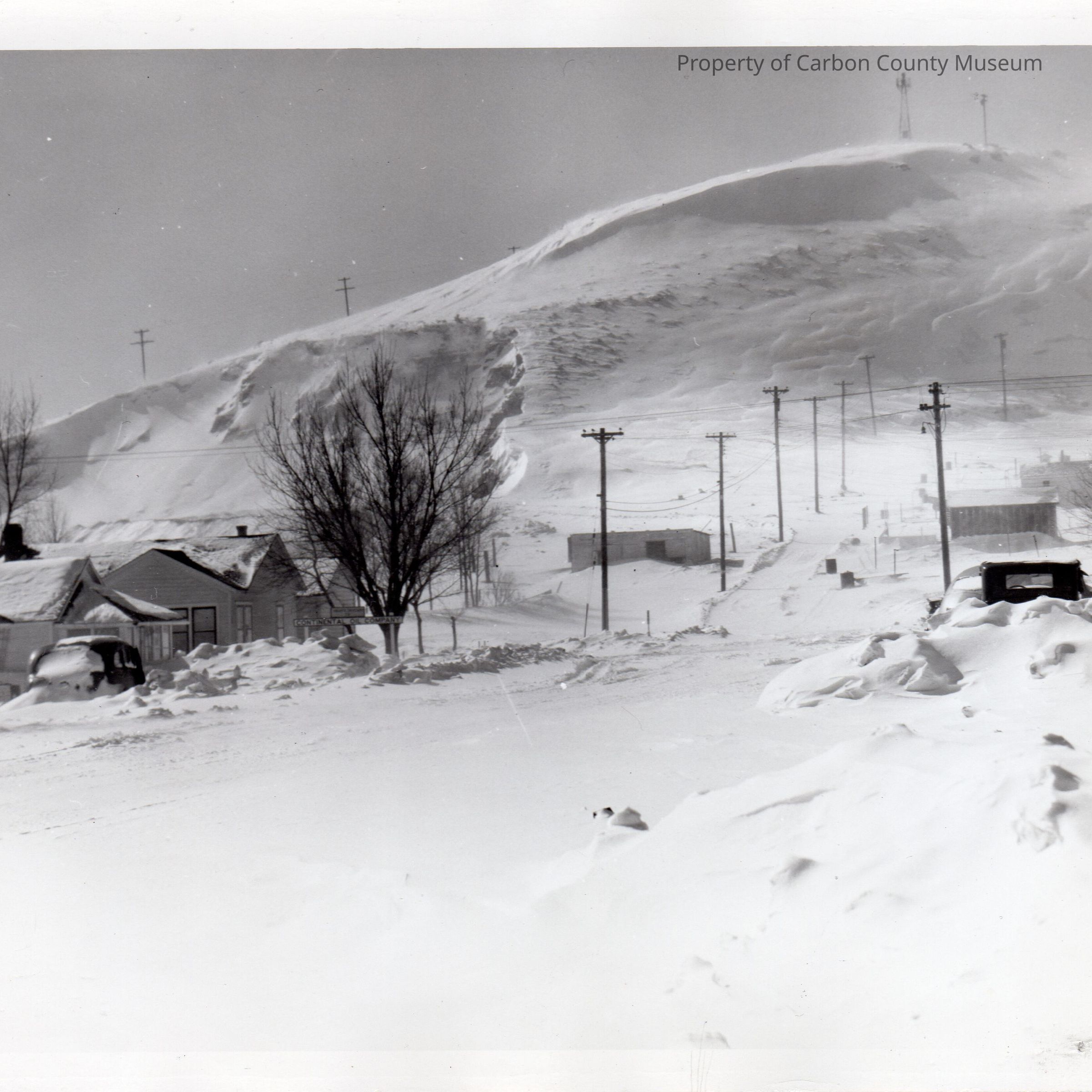 Update 2008: Black and white print of the 900 block of Cedar Street going West during the blizzard of 1949. Monument Hill is in the far background. Deep snow drifts show in foreground. Houses are on the far left with a black snow covered car in front. A small sign is in front of building on left side : "Continental Oil Company." Two vehicles are buried under snow on right side of road. Only the black cab of a truck is visible. Electrical poles go up the hill in a line on left.