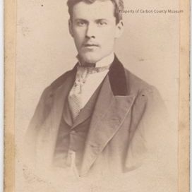 Black and white studio portrait, head and shoulders of a man with a white shirt, print tie, buttoned vest and jacket with darker collar. His hair is parted. Background is light. He has a watch chain in vest.