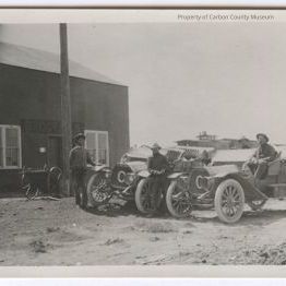 Update 2008: Black and white matte postcard print of a large dark metal building on left with a tall pole in front of door and a cart by the front door. Two men are standing on either side of the front of a vintage automobile. A second vintage automobile is parked to the right with a man sitting on the right side (driver's side) and another man on side left of front seat of auto. A box is on the running board and large rolled up bedroll? is stowed on backseat. Train cars are seen in background. Dirt ground is seen in foreground. Faint sign on building over doorway may read: Groceries. A large C is attached to front of radiator. A gas lamp is mounted by fender.