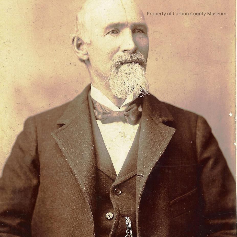 Black and white cabinet card, head and shoulders portrait. Balding man with white hair, white beard and mustache. He is wearing a 3 piece suit with bow tie. His jacket is open. He has a chain watch fob through button hole in vest.