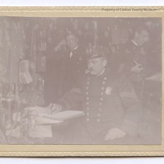 Update 2008: Black and white print attached to ivory matboard with decorative outer edge, of three men dressed in police uniforms with chevron stripes on arms and double breasted rows of metal buttons. Man in center is seated at desk and is writing in a ledger. A man is standing to his right with his right arm propped against the wall holding his head. Another officer is standing to back right looking at ledge and holding a pipe in his right hand.