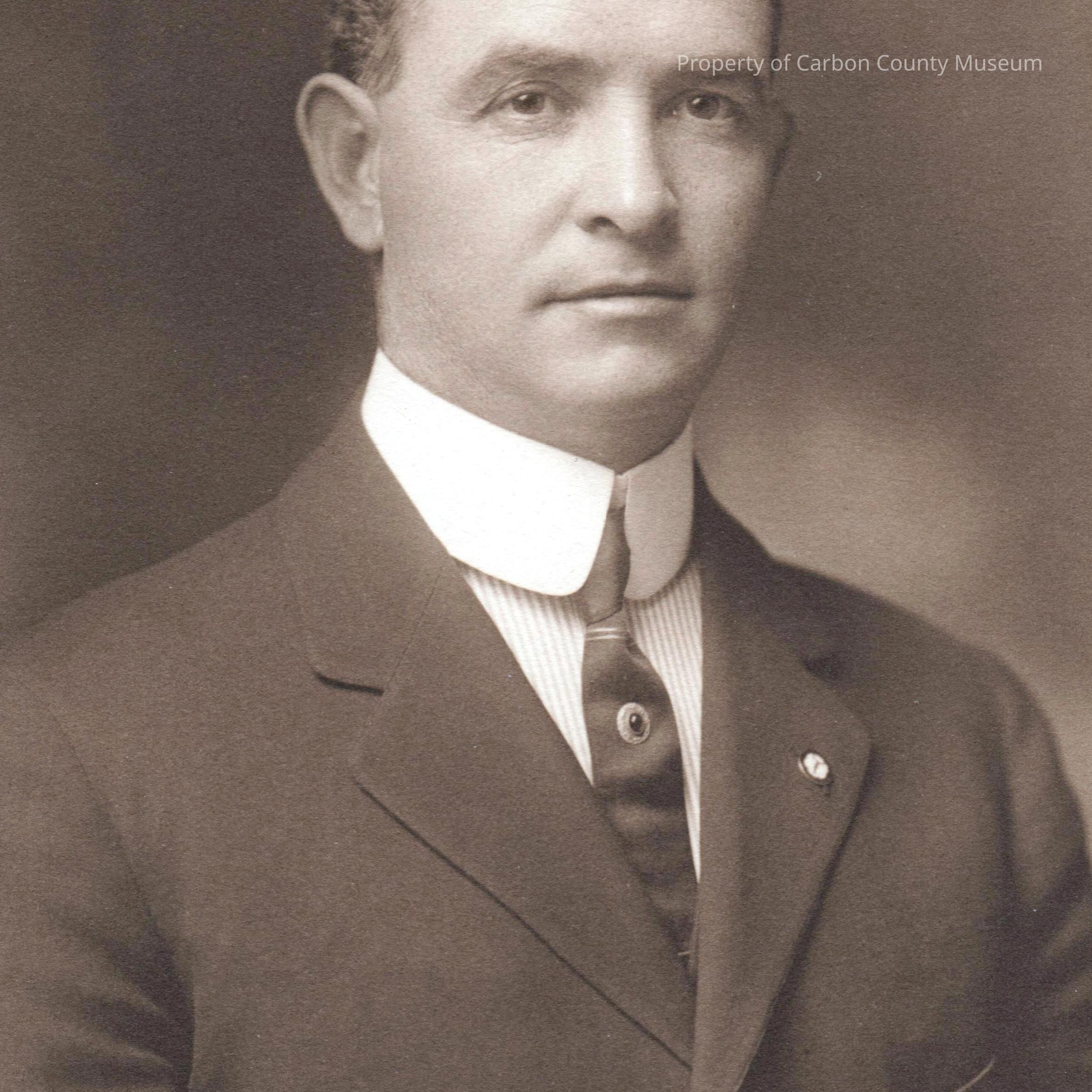 Black and white photo sepia, copy print of a man (head and shoulders portrait) with large white folded collar and white stripped shirt and dark tie. He has an oval tie tack in his tie. He has a lapel pin on his jacket. His hair is parted. On front of photo below picture in red is written "Schraibar Dallas."