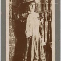 Black and white photo of man in a costume (or a woman?). She is in front of a drawn set of drapes. The person is wearing a tall lacy hat with shoulder length hair. A lace scarf around the neck with a pin, a mid length frilly dress with stripped socks and black shoes.