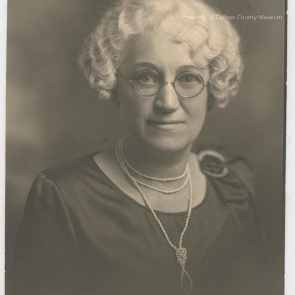 Update 2009: Sepia print. Studio portrait. head and shoulders image of a woman in a dark dress with a bow on the left shoulder. A triple strand of pearls is around her neck. She has short wavy blond or grey hair and is wearing oval wire-rim glasses.