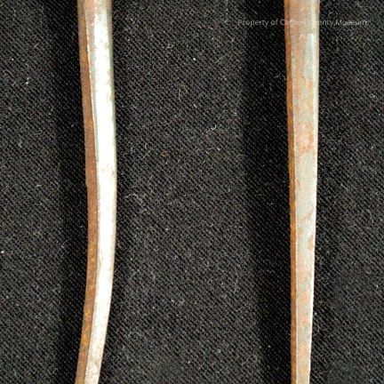Update February 2011: Tie plate - Iron, t x 7 1/2" with four holes and four ridges from the Elm Creek Tressle. Spike - Large 6", blunt head and painted end. Nail - two, 3" square nails, blunt head, sharp ends. Note: Only two of the six nails were found.