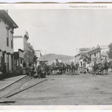 Update - 2009: Black & white copy print. Snapshot. Image of four teams of horses, each pulling buggies & wagons, posed on a dirt street. Post office sign on the building at left. People & baggage/bags on boardwalk at left. Buildings line both sides of the street. Hill in background.