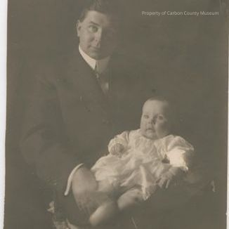 Dark black and white photo of a man holding a young baby on his lap. the man is in a three piece suit with white collar. Baby is in white clothes.