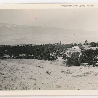 Update - 2009: Black & white print of birds eye view of ranch buildings surrounded by trees. Foreground is grass covered hill sloping down to a dirt road. On the other side of the road on photo right is a large light colored building with a roof sloping from a one story up to a two story on the other side. Two log buildings set next to that one with lean-to open area. Poles are between cabins. A garage is in trees behind log buildings. A two story house with a covered porch surrounded by a pole fence is in photo center. Trees are on photo left of buildings through which the Medicine Bow River is seen. Elk Mountain is in the background. There is snow in the crevices of the mountain.