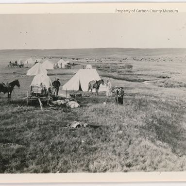 Update - 2009: Black & white print of tents & covered supply wagons. Cowboys on horses, & standing beside wagons & tents, are wearing hats, vests, bandannas, & dusters. One man is holding a shovel. There are canvas packs laying on the ground. A creek is seen on photo right. Livestock is grazing in the background.