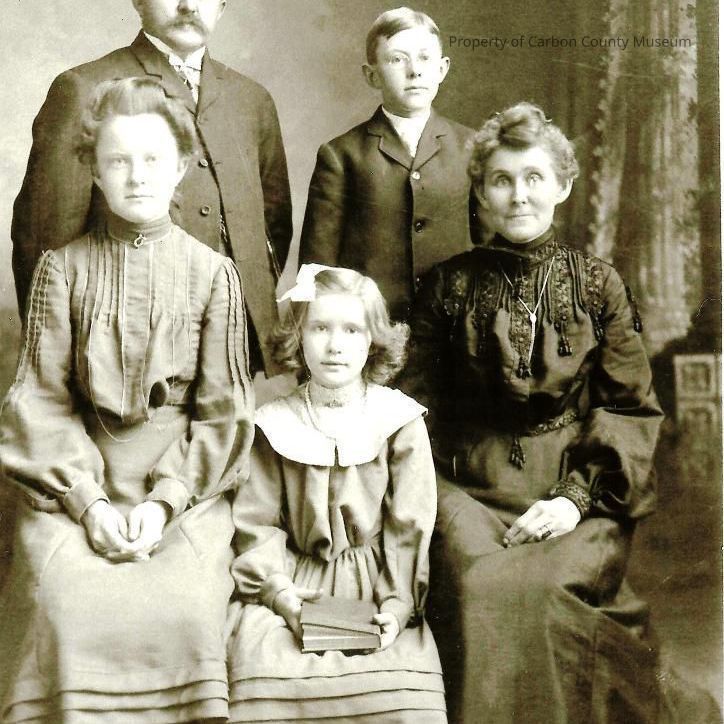 Black and white copy print, studio portrait, of a family. Back row has a man in a suite with mustache. Standing next to him is a boy in a suit with glasses. Sitting i front on the left is a girl with glasses wearing skirt and long sleeved top. Her hair is pinned up. Next is a girl with white bow in hair which is parted. She has a pearl necklace and large collar and his holding a book. Next to her is an older woman in a long black skirt, long sleeved blouse. Hair is pinned up. She is wearing a chain around her neck. Curtain in background.