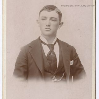 Update - 2009: Black & white print attached to white mat with gold on all edges. At bottom of print on mat is a blue script logo Brown on left side and Rawlins, Wyo on right side. Photo shows a studio portrait of a young man wearing a three piece dark suit with white shirt with high neck and a wide black tie around collar at neck. A chain watch fob is seen looping from upper pocket to vest top buttonhole. A white hankerchief is seen in outer jacket upper pocket. Young man has medium eyes & medium hair which is parted on left. His left ear extends out.