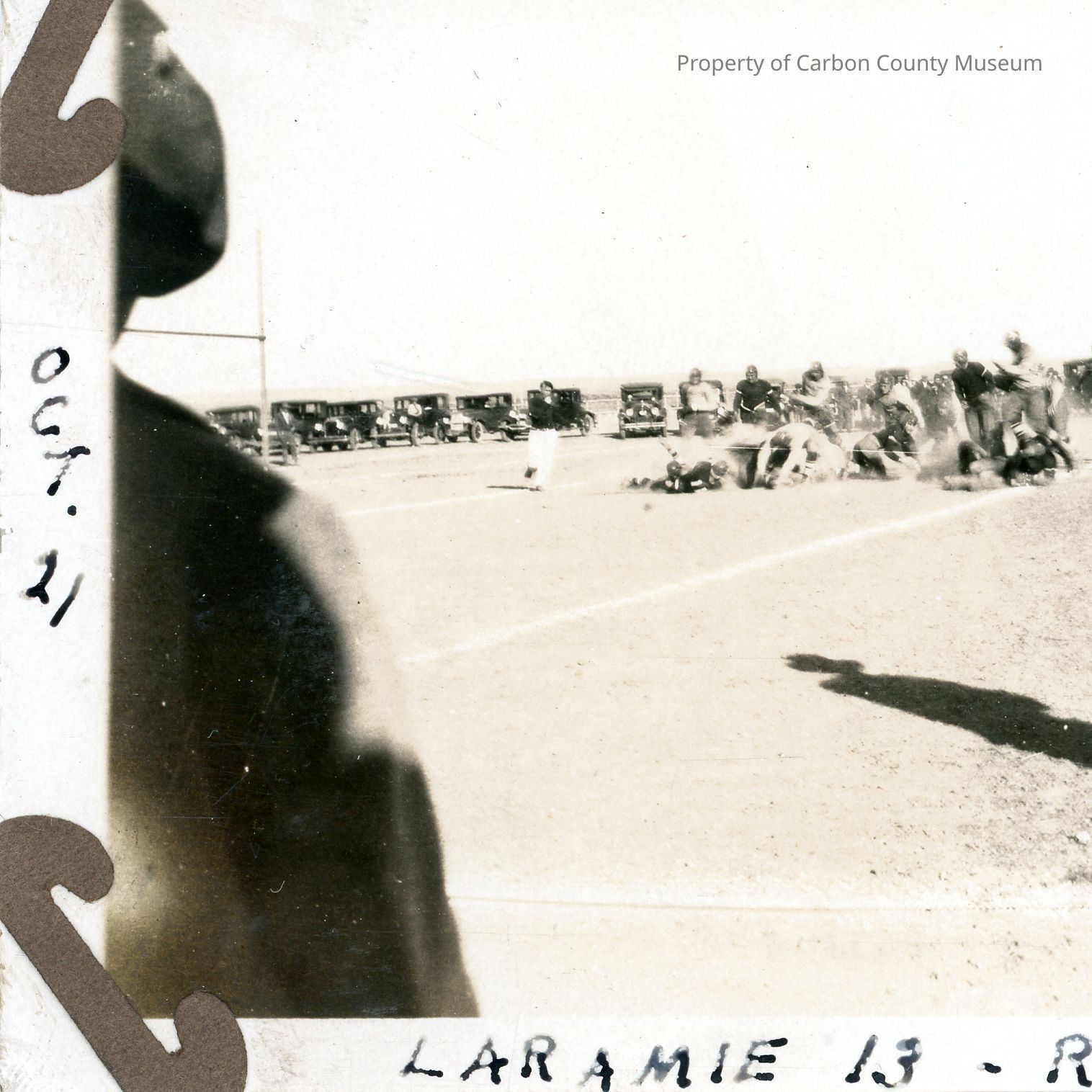 Black and white photograph. Multiple football players are seen either on the ground or running as the play begins. Written long the top edge of the photograph is "RAWLINS", along the bottom edge "LARAMIE 13 - RAWLINS 0", vertically along the left edge "OCT. 21", vertically along the right edge "1926". On the reverse the number 8 is printed,also present is a circular green stamp that reads "MEYERS PHOTOS PHOTO FINISHING RAWLINS, WYO".Collection