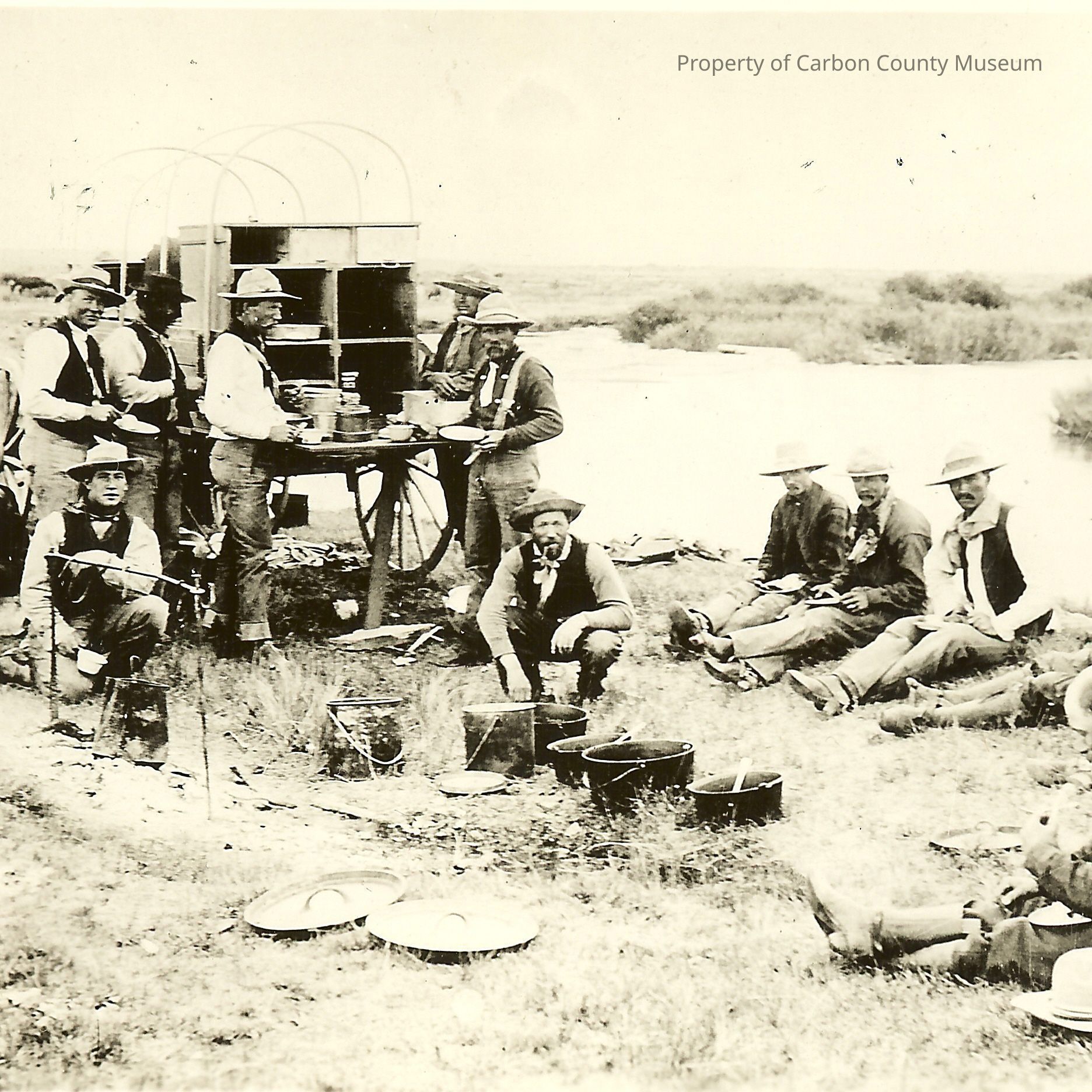 Men eating by river and chuck wagon. Update - 2009: Black & white print of cowboys sitting & standing beside a cook wagon. Some are holding plates or cups. Large pans & lids are setting on the ground. A metal bar with hooks is above a coffee kettle. Another wagon can be seen in the background & a creek is on photo right.