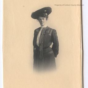 Update 2009: Black and white print attached to white mat which has been irregularly cut off. Studio portrait shows woman dressed in dark long sleeved suit type dress with long ornate hanging lapels which extend around edge of open garment and hang loose below waists, at front on each side. A white high neck pintucked blouse is seen under bodice front. The dark haired woman has an updo with a very wide brimmed hat atop. Her arms are clasped behind her back.