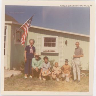 Color snapshot of family in front of a pale green house with an American Flag. Woman stands on left in blue pantsuit. Next is a man seated wearing a straw hat and green shirt. A lady is next holding a hat. A young girl in shorts and a boy in striped pants and black hat are next. Standing on right is a tall man in white pants holding a can. Sign on house" Baringers". Man on right is Al Winzenried.